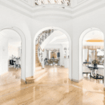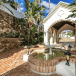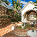 The estate is complemented by a sparkling swimming pool surrounded by a sun deck, covered terraces for outdoor lounging, a three-car garage, and ample additional parking. Expansive gardens create a private oasis, blending tropical landscaping with Mediterranean charm.