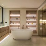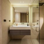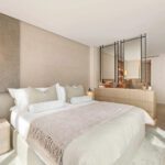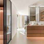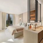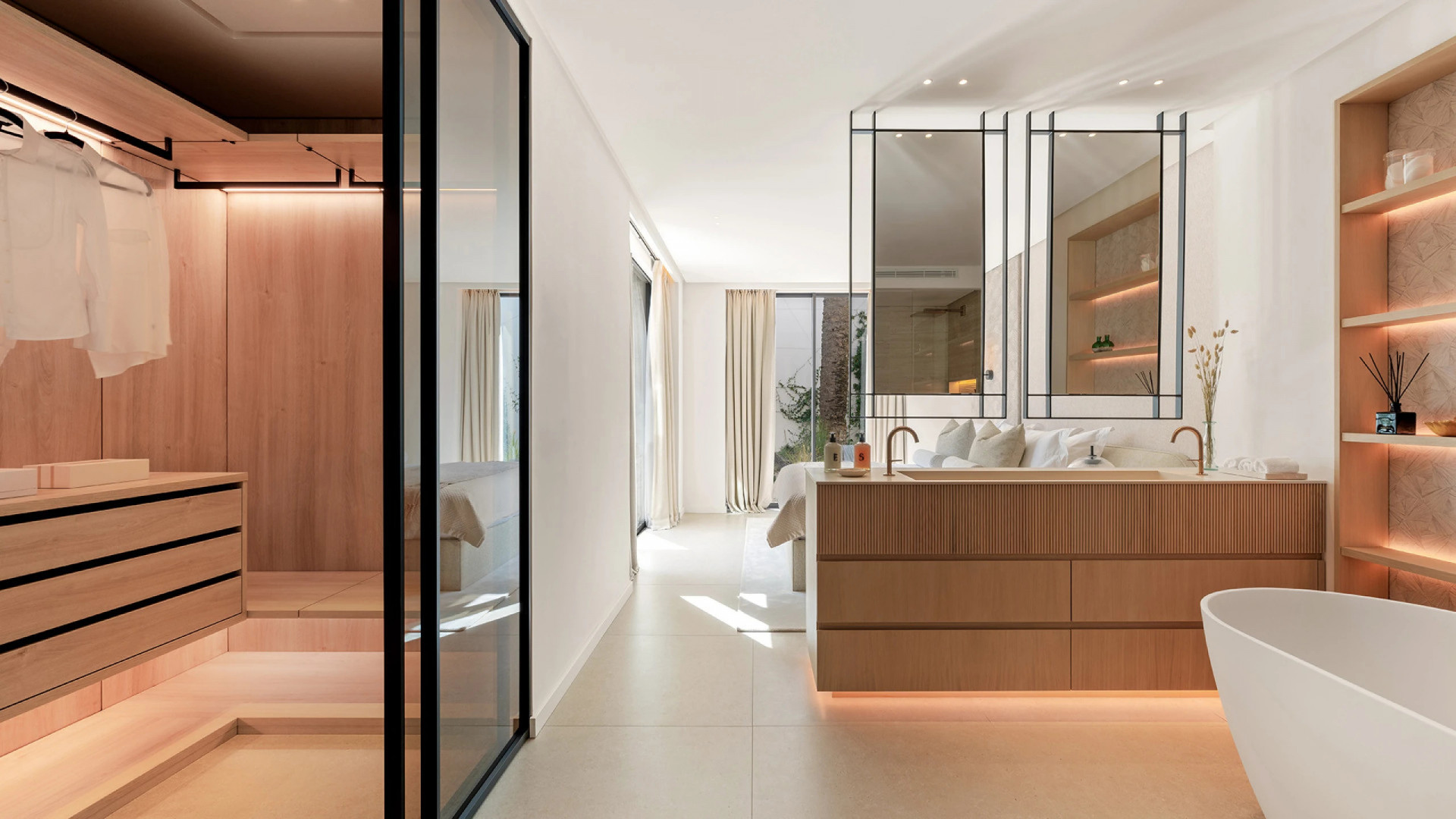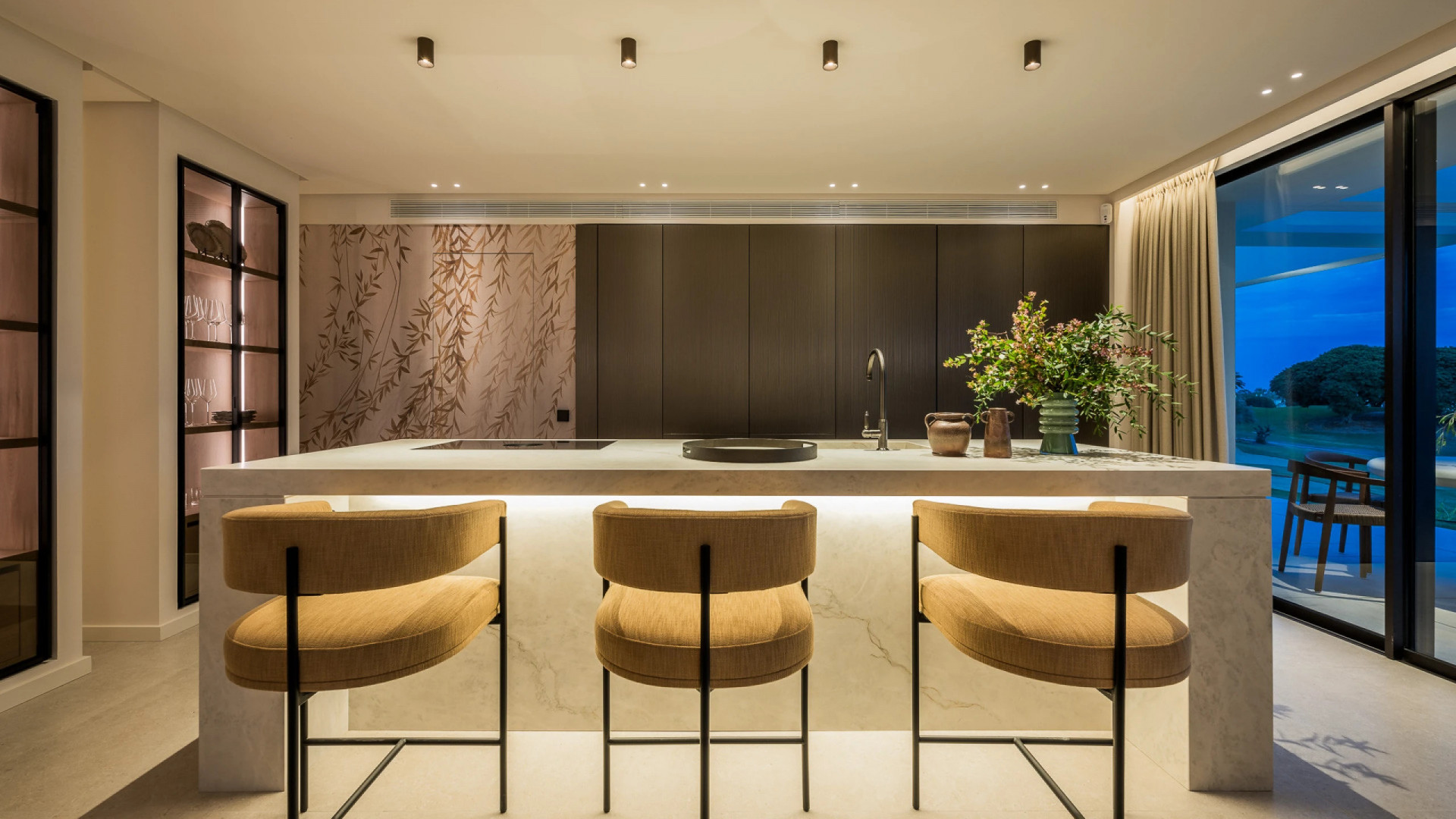 On this level, you'll find four en-suite bedrooms, each with its own private terrace. The master suite, spanning almost 40 m2, features a walk-in closet and a designer bathroom, creating an indulgent, open-plan retreat. The pool area and terrace are designed for relaxation, with multiple lounge areas and water features that complement the pool. A buggy garage offers direct access to the golf course.