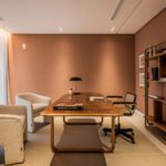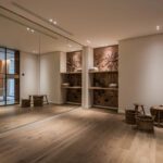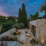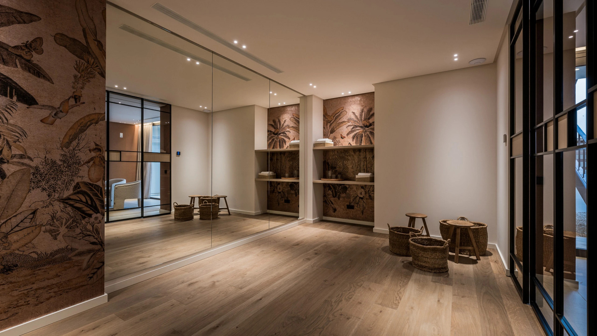 The rooftop terrace is a dream for entertainers, featuring an outdoor kitchen, seating and dining areas, an outdoor cinema, and a jacuzzi, all while offering breathtaking views of the golf course and valley. In the basement, you'll find a gym with dark wooden walls and ceiling, as well as a home office.