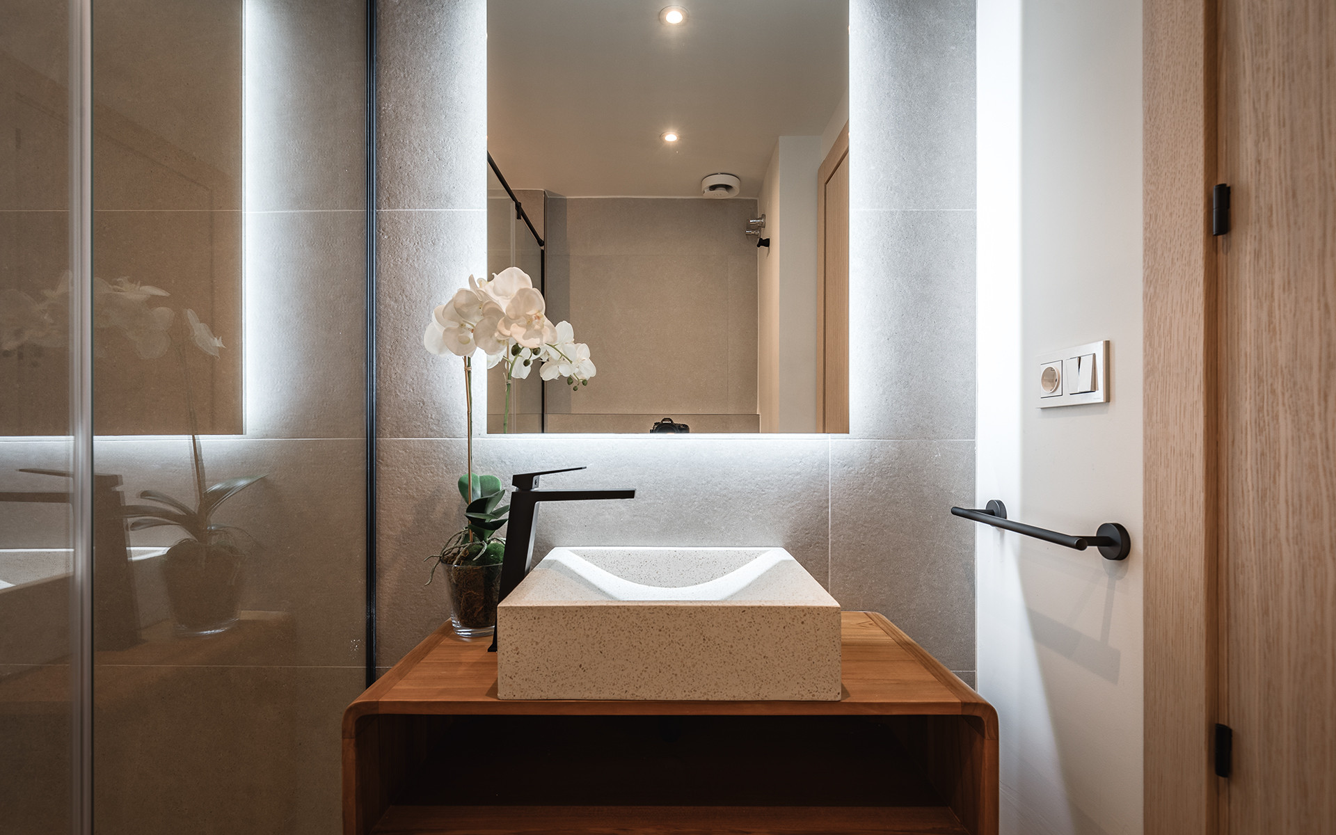 The master bedroom boasts an en-suite bathroom, while the second bedroom has access to a separate full bathroom. Both bedrooms enjoy picturesque views of La Concha Mountain. Additional features include hot and cold air conditioning and an underground parking space.