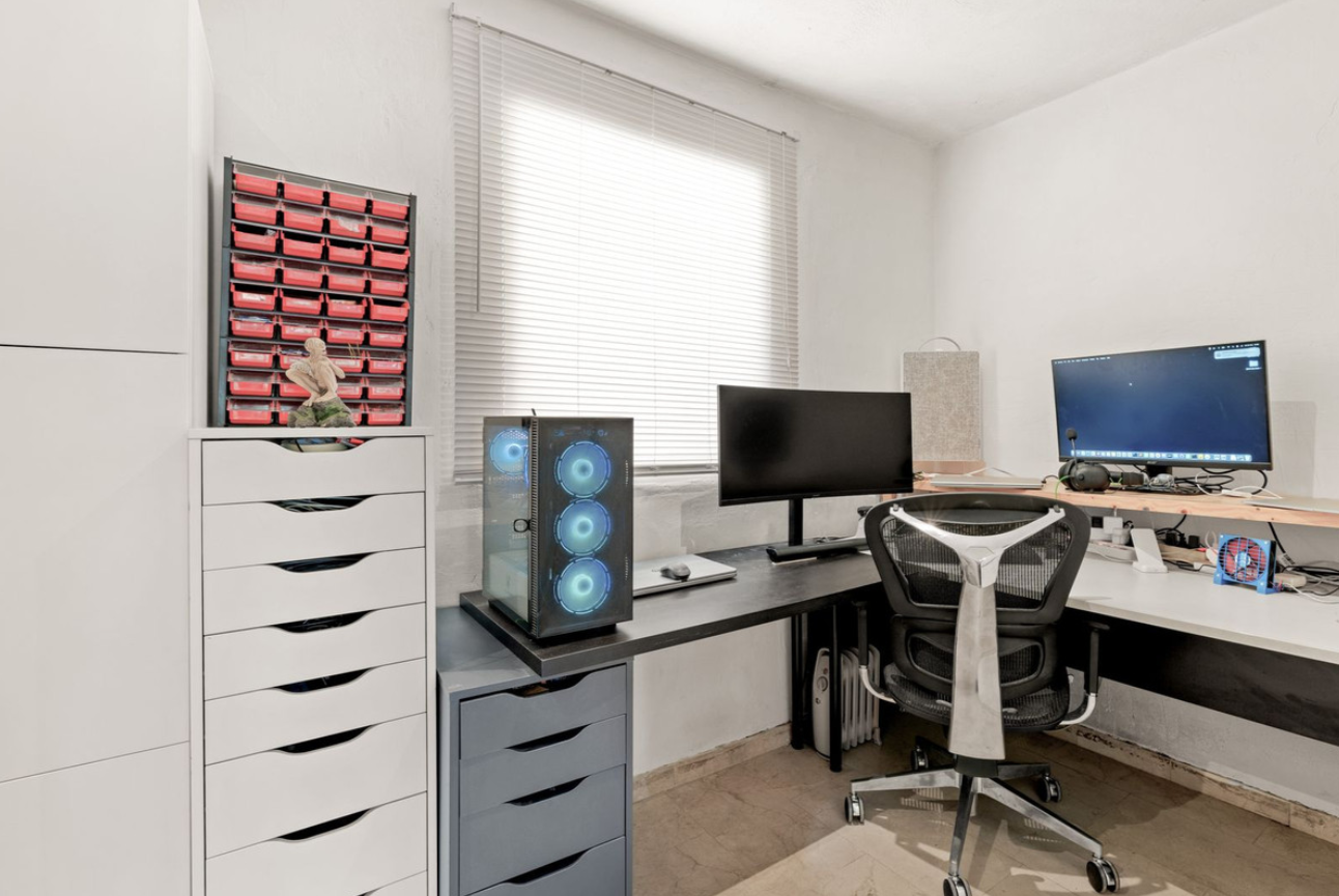 Die Villa verfügt über zwei Gästezimmer, die derzeit als Büros genutzt werden, sowie ein Gästebad und ein separates WC. Das Hauptschlafzimmer ist besonders geräumig, mit einem begehbaren Kleiderschrank, einem eigenen Bad und Zugang zur Terrasse.