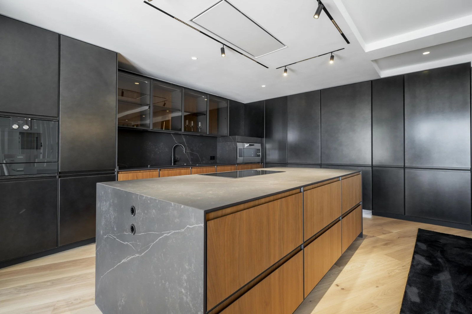 The heart of the villa is the spectacular living area, warmed by an ethanol fireplace and featuring a stylish sitting lounge, an elegant dining space, and a sleek open-plan kitchen with a central island and top-of-the-line Gaggenau appliances. Floor-to-ceiling glass doors lead to a spacious terrace with an outdoor kitchen, BBQ, and lounge area—ideal for entertaining against a backdrop of stunning sea views. A landscaped garden surrounds the pool and sun deck, where avocado, lemon, and mango trees thrive.