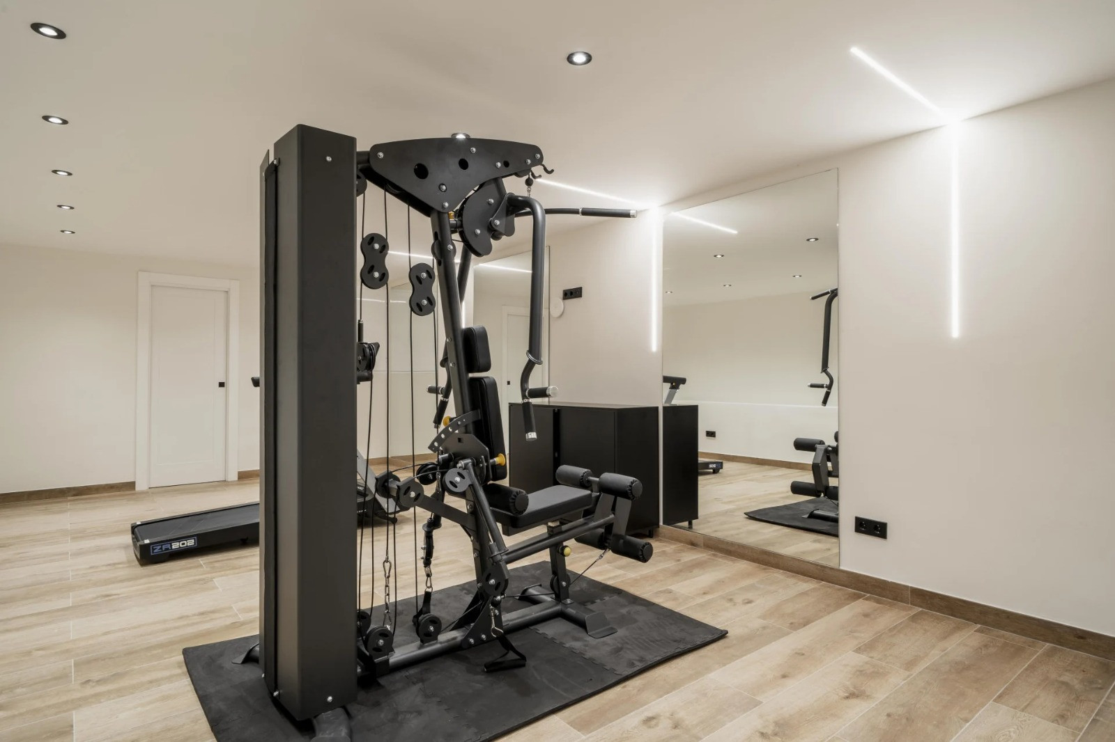 A separate building with its own entrance, housing a wine cellar, fully equipped gym, and bathroom