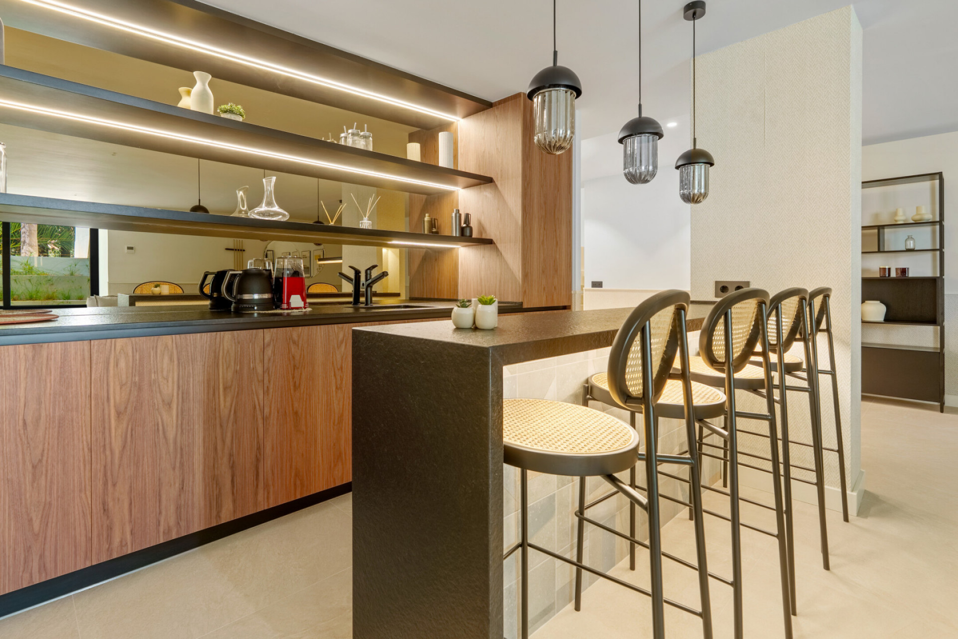 On the lower level, a stylish entertainment room invites informal gatherings with its lounge area, bar, and pool table—perfect for relaxed evenings or hosting guests. This additional space enhances the villa’s functionality while preserving the ease of one-level living.