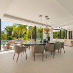 The heart of the villa features a spacious living area that effortlessly integrates lounge, dining, and kitchen zones. Floor-to-ceiling sliding glass doors open fully to the landscaped garden and pool, creating a fluid transition between the interior and exterior. Clean architectural lines, warm wood accents, and a palette of natural tones bring a sense of understated luxury throughout.